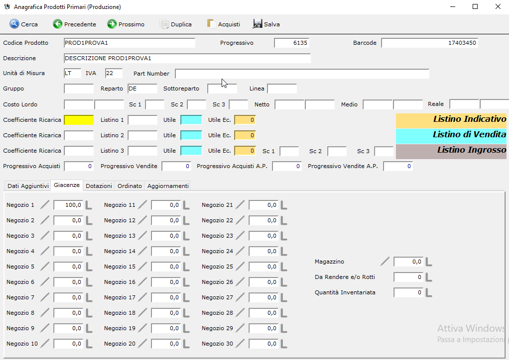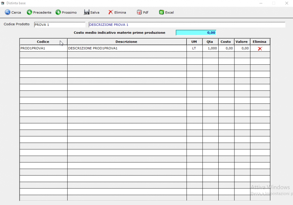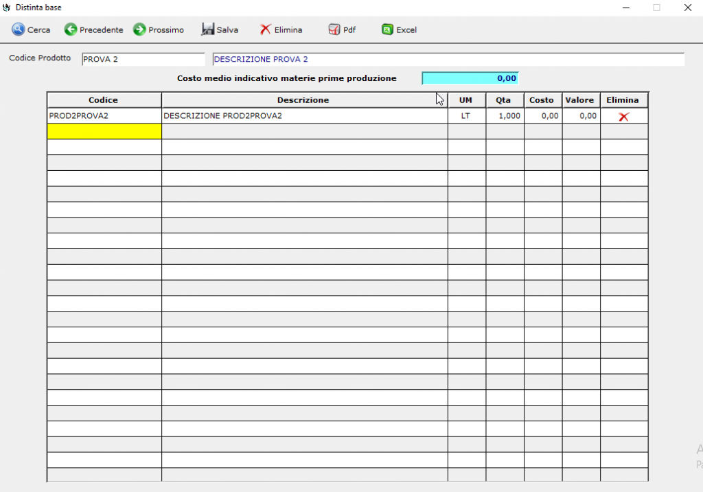 Ai nostri prodotti ora creati manca la relativa distinta base, ovvero quei prodotti che sono necessari per la produzione di “PROVA1” e “PROVA2”. Per poter creare dei prodotti primari esiste un apposita anagrafica: ANAPROP (Anagrafica Prodotti Primari).