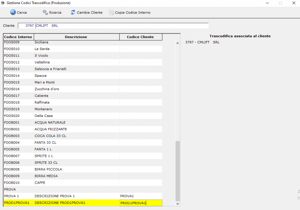 Trascodifica codiciAssociare i Codici Interni con i Codici Cliente in questo modo. |