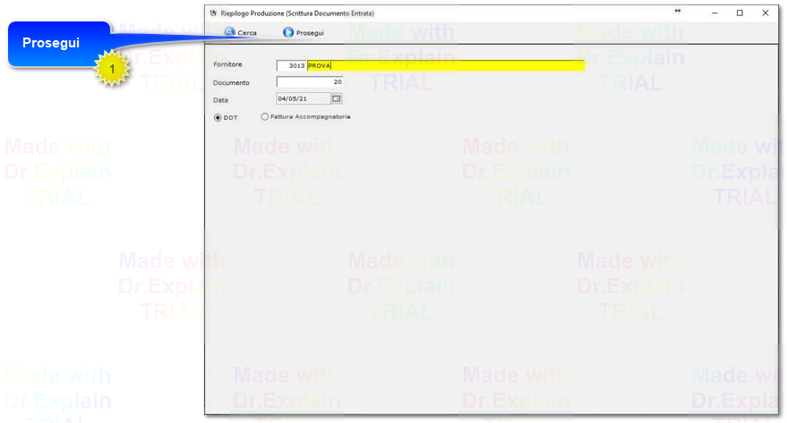 Quando si vuole procedere con la chiusura dell’attività di produzione selezioniamo “Conferma” per poter compilare i campi “Fornitore”, “Documento” e “Data” della produzione, specificando se il documento si tratta di una DDT o di una fattura accompagnatoria (Figura 12).