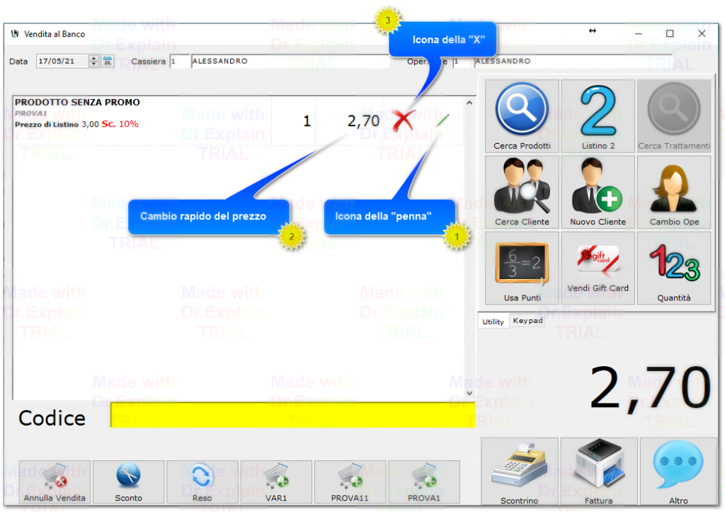 N.B. Con la procedura sopra illustrata si vanno a modificare dei parametri che sono relativi al singolo prodotto e non a tutta la vendita. Per esempio lo sconto viene applicato solo a quel prodotto, se si vuole conoscere come poter applicare o modificare uno sconto sul totale della vendita si prega di continuare a leggere la guida.