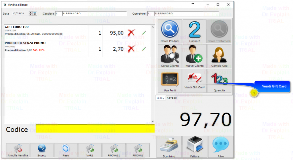 Cliccando sul bottone “Vendi Gift Card” si apre una finestra da cui è possibile vendere un buono/gift card, e una volta selezionato, virrà aggiunto alla vendita come se fosse un prodotto vero e proprio. (Figura 13)